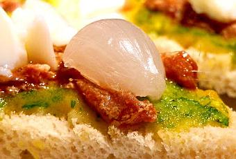 cucchiaio di prezzemolo tritatoPREPARAZIONE Bollire l'uovo per 8 minuti. Sgusciarlo e prelevare il tuorlo. Metterlo in una ciotola e mescolarlo con l'aceto di vino, l'olio e.v.o. e il prezzemolo tritato. Mescolare per bene così da emulsionare gli ingredienti. Regolare di sale e pepe nero. Privare della crosta il pane e dividerlo in due a triangolo. Tostare le fette e poi spalmale con il composto di uovo. Disporre i filetti di acciuga divisi in due o tre parti e rifinire con le cipolline sottaceto divise in due e qualche dadino di albume, precedentemente salato.