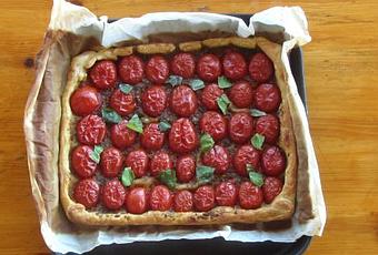 ingredienti: 1 rotolo di pasta sfoglia rettangolare pomodori ciliegia (del mio orto!) 1 vasetto di salsa ai capperi BONOMO & GIGLIO qualche foglia di basilico (delle mie piantine!!)