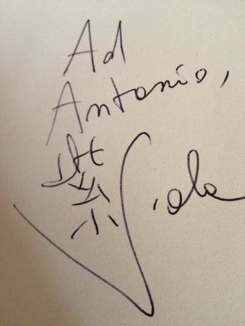 A una domanda di Fabrizio piuttosto articolata dove sottolinea la cifra stilistica raffinata (non avevo però tralasciato di parlare di echi calvinisti poco prima) Viola risponde con un “Sì”, secco e brutale nel suo candore. Non riesco a trattenermi e racconto di quella volta che ho intervistato Luciano Canfora e che a una mia domanda lunghissima sugli archivi e sulla mole di informazioni attualmente disponibili e l’energia necessaria per catalogare tutto (domanda che non avrei usato privilegiando le risposte) mi liquidò con “E’ vero, ha ragione”. Finisce la presentazione, Viola rimane in disparte, le chiedo di firmarmi il libro. Quando vedo la sua firma con degli ideogrammi cinesi all’interno della V capisco dove ho sbagliato. Non per aver capito il significato dei segni. Non per il messaggio. Perché Viola fa sul serio.Antonio Prenna
