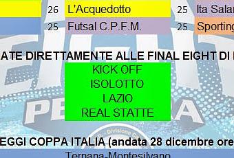 In base alla classifica avulsa al termine del girone di andata, le prime di ogni girone e la migliore seconda si sono qualificate direttamente alle F8: Kick Off (1° girone A), Lazio (1° girone B) e Real Statte (1° girone C). Come migliore seconda è passata l’Isolotto che ha terminato a 33 punti, vincendo l’ultima partita in casa dell’Elmas dopo un’odissea per raggiungere l’isola. Aveva sperato in un risultato a sorpresa in terra sarda il Montesilvano, che fino a due giornate dal termine era la favorita al trono di migliore seconda, prima di essere bloccata sul pareggio dal Città di Falconara, alla penultima giornata. Pareggio costato i preliminari di Coppa. L’avversario delle abruzzesi sarà la Ternana Futsal che proprio all’ultima giornata ha conquistato il diritto di giocarsi gli spareggi, vincendo sul proprio campo contro il Torino, ma soprattutto grazie al harakiri del Futsal Breganze che si è fatto recuperare dalla Thienese quattro gol di vantaggio regalando alle ferelle il quarto posto.