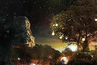 I due mondi opposti convivono perfettamente in “The Future Shangri-La”, dove sorgenti di luce soprannaturale sono raffigurate accanto alla tranquillità notturna della natura sotto un cielo pieno di stelle.