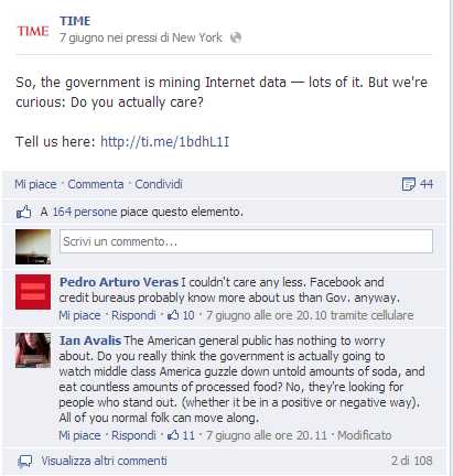 A poche ore dalla pubblicazione dell'inchiesta sulla National Security Agency e sul programma PRISM, diverse testate online, come ad esempio il Time, hanno provato a tastare il polso degli utenti per capire la portata dello scandalo. La percezione generale dei cittadini americani, emersa dai sondaggi e da migliaia di commenti postati sui social network, è che questo tipo di prassi per il monitoraggio e il controllo, sia pienamente accettabile nei termini in cui fornisca una garanzia per la difesa della nazione.