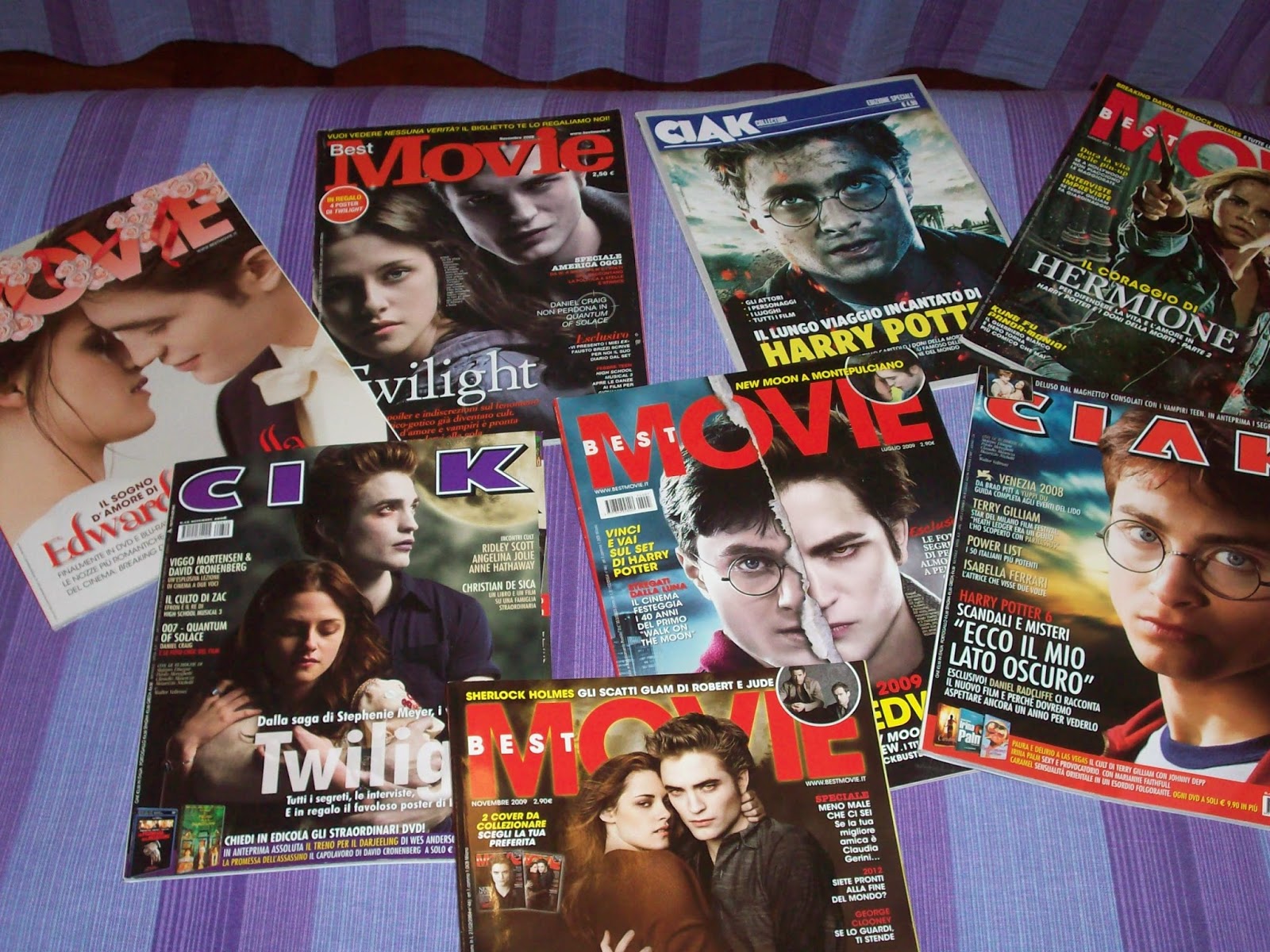 Alcuni tra i giornali dedicati ad Harry Potter che non butterò mai, mai, mai, e Twilight, che invece potrei benissimo buttare (ormai sto iniziando ad odiarlo!)