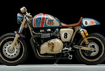 Ha appena compiuto due anni questa realizzazione di Sucker Punch Sally, normalmente preparatore di custom e choppers V-twin proudly made in USA... Ispirato al mito della strafamosa e amatissima chitarra Fender, la Bonnie in questione ha rappresentato una interpretazione della moto britannica in stile yankee (appena attenuata dall'utilizzo pedissequo della livrea Union Jack, peraltro molto ben realizzata), un'idea su cui il costruttore non è più tornato... Ricordavo il ferro, infatti, ma non ricordavo l'autore. Il risultato, IMHO, appaga sicuramente l'occhio... Ma, a mio avviso, solo per brevi periodi. Comunque sia, è un gran bel pezzo da blog... Come esimermi?