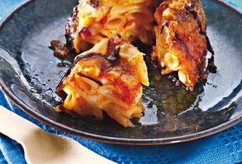 - Ripiegate le fette di melanzana, spolverizzate con pangrattato e infornate a 200 °C per circa 15 minuti.