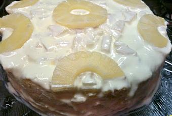 FERMA CON LE FRUSTE, LE FETTINE DI ANANAS TAGLIATE A TOCCHETTI. BAGNARE I SAVOIARDI CON IL SUCCO DELL'ANANAS, FARE STRATI, COPRIRE CON