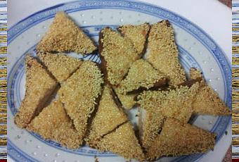 questi toast sono preparati con pancarrè ricoperto di semi di sesamo e conditi con l'immancabile salsa di soia