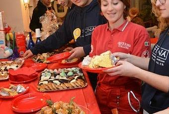 I giovani della CRI e del Forum, Rosa e Verdiana, imbandiscono la tavolaSotto : Pamela e Rosalba.