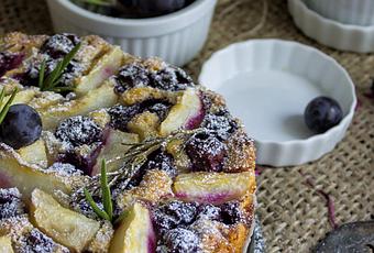 - Sistemare sulla superficie della torta in modo casuale ma ordinato sia gli acini di uva fragola avendo cura di premere un po' che le fette di pera. Aggiungere due pezzetti di rosmarino.