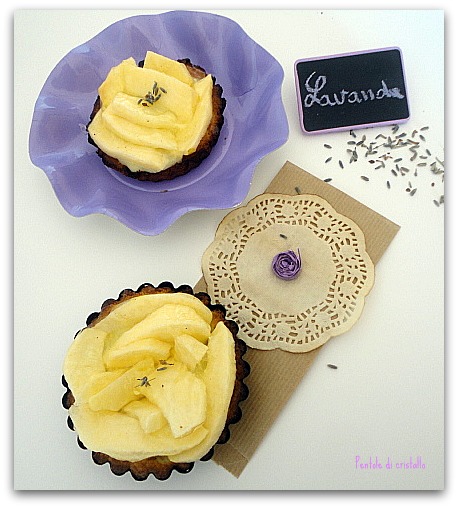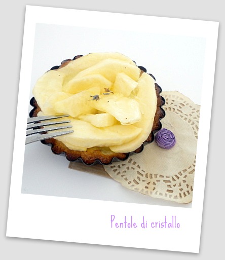 Mettere nel mixer, e azionare per 30 secondi, il burro e lo zucchero. Setacciare la farina 00 ed aggiungerla al composto, ai fiori di lavanda. Aggiungere, al bisogno, 1 o 2 cucchiai di acqua fredda per ammorbidire leggermente l'impasto.Anemone ha usato anche il fior di sale, io non ce l'avevo, quindi un pizzico di sale da cucina. Avvolgere il tutto in pellicola trasparente e lasciar riposare in frigo per circa 30 minuti. Nel frattempo prepariamo la crema pasticcera mettendo a sobbollire il latte in una capiente casseruola.A parte lavorate i tuorli con lo zucchero, fino ad ottenere una crema morbina e densa, poi incorporate la farina setacciate e unite al latte con una frusta e fate sobbolire per qualche minuto a fuoco dolce.Imburriamo gli stampini e adagiamoci la frolla alla lavanda, farciamo di crema pasticcera e cuociamo il tutto a 170°C per circa 15 minuti.Quando saranno cotte adagiamoci le fettine di mela precedentemente pulita e la gelatina con l'aiuto di un pennello in silicone.Servitela calda con un buon thè bianco..