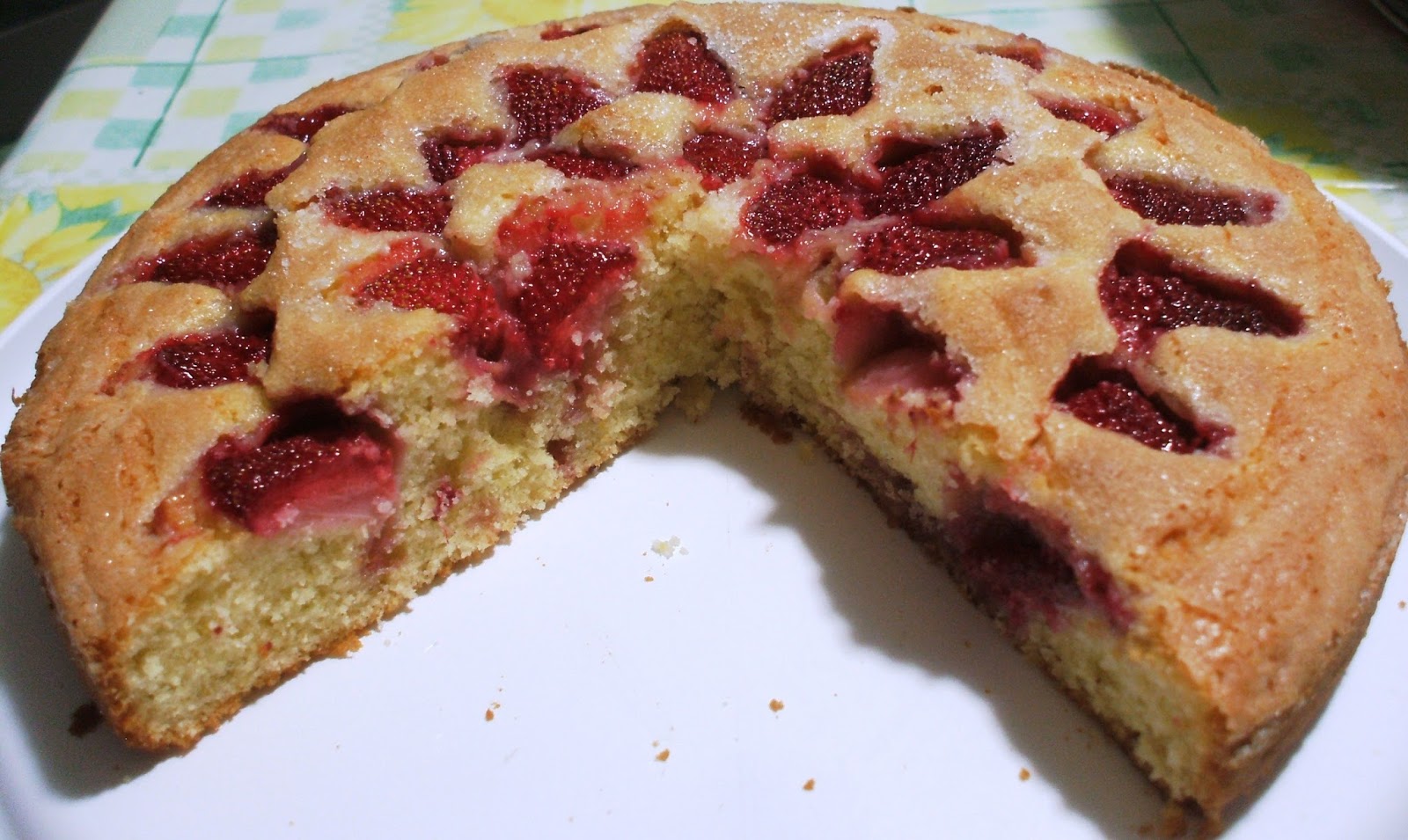 Versare nella teglia imburrata e infarinata, livellare, e disporre le fragole tagliate a metà per il lungo, in cerchi concentrici, con il lato tagliato verso il basso. Spolverare tutta la superficie con due cucchiai di zucchero semolato ed infornare a 170° per 10-15'. Abbassare a 150° e proseguire la cottura per altri 20' circa o comunque fino a che, provando con lo stecchino, questo esce pulito ed asciutto.