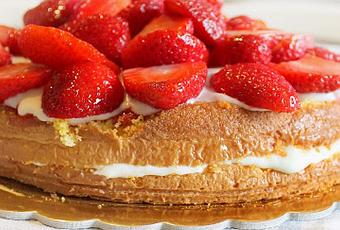 Con un coltello a sega toglier la parte bruna sulla superficie del Pan di Spagna e poi tagliarlo a metà. Bagnare la base con lo sciroppo di fragola e mettere abbondante crema, coprire con il secondo strato e ripetere aggiungendo però meno crema. Decorare con fragole fresche.