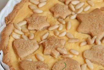 Preparare la torta: stendere 2/3 della frolla in una sfoglia di 5-6 mm di spessore e foderare uno stampo di 24 cm, imburrato e infarinato. Versare la crema sulla frolla. Con la frolla rimasta, ricavare dei decori con delle formine per biscotti, sovrapporli alla crema. Spolverizzare con i pinoli, lasciati in acqua fredda per qualche minuto, cuocere in forno già caldo a 180°C per circa 50 minuti.