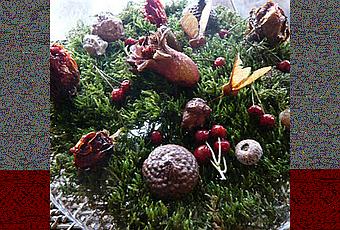 cosa serve: alzatina in vetro muschio bacche e semi secchi