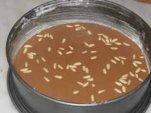 Per la base amalgamare gli albumi con una frusta per pochi istanti ed unire poco per volta lo zucchero e successivamente la maizena. Ungere con l’olio uno stampo a cerniera da 22 centimetri ed infarinarlo. Versarvi il composto preparato che risulterà piuttosto fluido, cospargere la superficie con i pinoli e cuocere in forno a 200 gradi per10/12 minuti