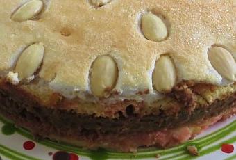 Fare uno strato di meringa sopra il disco di pasta, distribuire le mandorle,spolverizzare con il terzo cucchiaio di zucchero, poi passare in forno a 100 gradi per circa 20 minuti.