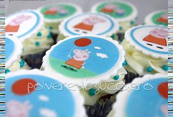 Dopo la torta con Topolino che ho realizzato per il primo compleanno di Daniele lo scorso anno, quest'anno la festa è stata a tema Peppa e George i due simpatici porcellini.E così ecco la torta e i cupcakes che ho realizzato per lui quest'anno: le decorazioni della torta sono state interamente realizzate a mano in pasta di zucchero, mentre per i cupcakes sono state usate delle cialde applicate ad un dischetto di pasta di zucchero.