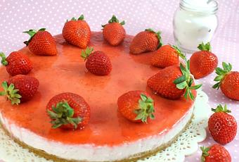Per la gelatina, frullate le fragole con lo zucchero. In un pentolino, fate sciogliere la gelatina nell’acqua, aggiungete le fragole frullate e fate sobbollire. Fate leggermente raffreddare e versate delicatamente sopra la torta. Fate indurire, decorate con le fragole e servite.