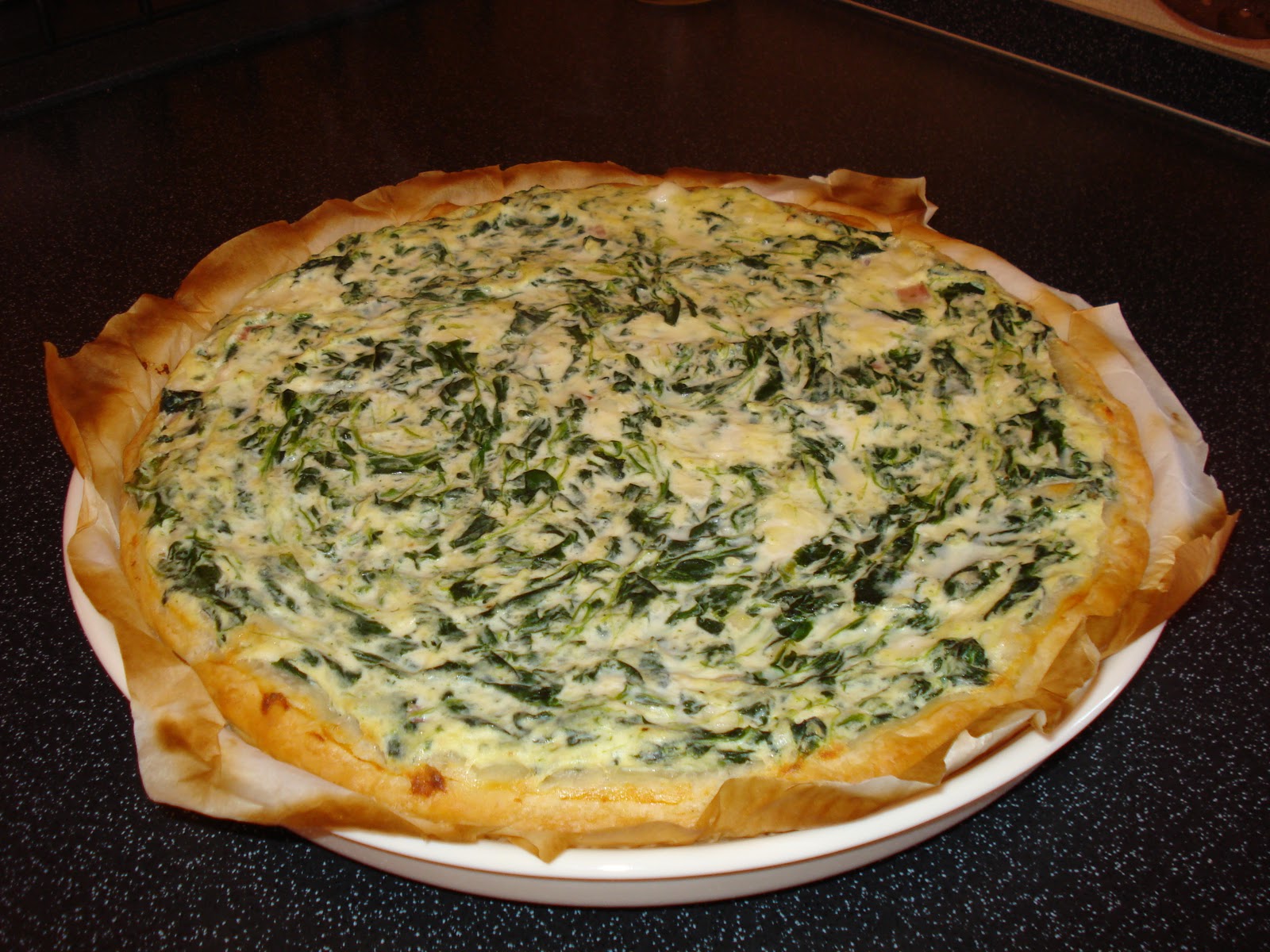 Stendere la sfoglia in una tortiera, ripiegare i bordi, bucherellare il fondo e mettere il ripieno.