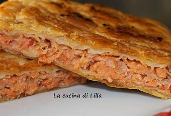 Stendere la sfoglia e ricoprire con un sottile strato di passata di pomodoro. Disporre al di sopra il pomodoro tagliato a fette, le fette di salmone affumicato e i dadini di mozzarella. Richiudere il rotolo, bucherellare con la forchetta e cuocere per 30 minuti a 200°.
