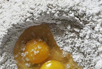 - Per la sfoglia. Disporre le farine setacciate sulla spianatoia, fare spazio al centro del cono con le mani.