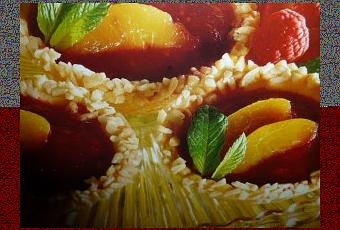 tritate le mandorle spennellate il bordo dei tortini e passatele nelle mandorle tritate riempite con il frullato di frutta de decorare con la pesca e menta