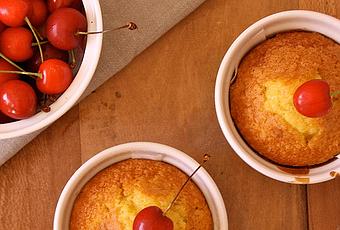 Vi capita mai di andare a trovare amici o parenti e ritrovarvi con vagonate di frutta/verdura appena colta?! Ecco questo è all'incirca quello che mi è successo questa settimana - con estrema gioia ovviamente.. visti i prezzi proibitivi delle ciliegie!! Nonostante poi mio marito faccia parte della filosofia "una tira l'altra", soprattutto dopo cena, ecco che qualcuna sono riuscita anche a toglierla dalle sue grinfie per poterne fare un piccolo dolce! Volevo qualcosa di semplice e monoporzione et voilà.. ecco delle morbidissime e profumatissime mini tortine! Per comodità le ho cotte nelle ramequins, ma potete utilizzare tranquillamente uno stampo per muffins, l'importante è che sia ben imburrato. Nel caso in cui vogliate utilizzare le ramequins vi consiglio di tagliare una striscia di carta forno e posizionarla prima di versare l'impasto (imburrate sempre tutto, mi raccomando!). La ricetta è velocissima e perfetta anche per i più piccoli. Al primo assaggio poi, queste tortine, assomigliano a dei piccoli e soffici plumcakes, almeno fino a quando non si arriva alle ciliegie.. da qui in poi è tutto una goduria! Per circa 10 tortine.