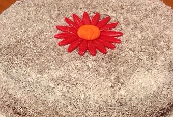 Ho usato la ganache sia come ripieno del pan di Spagna, che come copertura ed infine sopra ho sparso della farina di cocco che ha aderito perfettamente alla ganache ancora liquida.