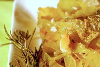 Aggiungere il rosmarino e l'insaporitore nelle patate e versarvi sopra uno strato di cavolo cotto. Proseguire gli strati fino al termine degli ingredienti.