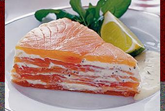 -foderate uno stampo(il libro ne indica uno da 18 cm) con pellicola trasparente lasciandola debordare, rivestite con le fette di salmone affumicato e versate dentro metà del composto