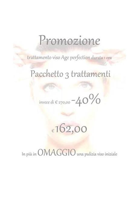 Trattamento viso Age Perfection della durata di 1 ora che comprende un pacchetto 3 trattamenti a 162,00 € invece che 270,00 € (-40%) + in OMAGGIO una pulizia viso iniziale.Questo trattamento cosmetico svolge un'azione anti-età* globale, uniformante ed illuminante.Indicato per pelli che presentano rughe, discromie, pori dilatati e colorito disomogeneo.Rughe diminuite fino a (media del -14.6%* **)Luminosità incrementata fino a (media del +14.5%* **)Levigatezza incrementata fino a (media del +12.9%* **)Macchie ridotte fino a (media del -12%*)Autocura :• Crema viso globale giorno • Crema viso globale notte • Crema globale contorno occhi e labbra• Siero globale visoPromozione valida dal 23/09/2013 al 5/10/13Cristina