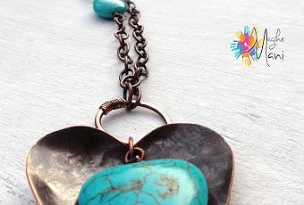 un cuore creato con lamina di rame e imbutito che accoglie il piccolo cuore di pasta di turchese (o aulite) come una conchiglia.Buon week endGrazia