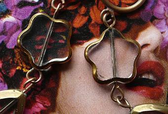 Orecchini in rame con gancio tondo per lobi non forati (è possibile cambiarlo su richiesta) e perle barocche piatte in vetro grigio chiarissimo con profilo metallizzato ramato a forma di fiore e goccia