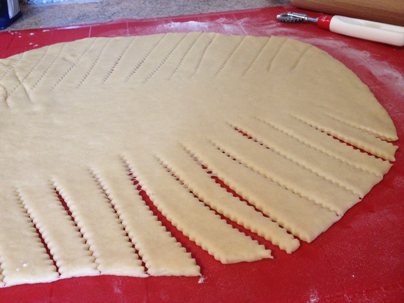 Passato il tempo, stendete il panetto sulla carta forno e trasferitelo dentro la teglia, con una rotellina o un coltello, tracciate delle linee leggerissime per ottenere la sagoma, cioè create un rettangolo al centro. Poi, invece, tagliando la pasta create delle strisce inclinate ai bordi del rettangolo e rimuovete i primi tagli.