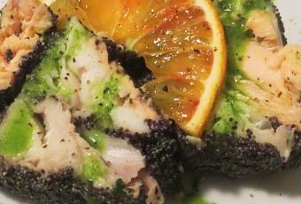 Salmone e persico intrecciati tra loro, cotti al forno impanati in una crosta di semi di papavero e serviti con una salsina emulsionata di basilico e olio extravergine d’oliva. Un secondo piatto leggero, da servire dopo un buon primo di mare, come ad esempio i Tortelli di patate al tocco di triglie.