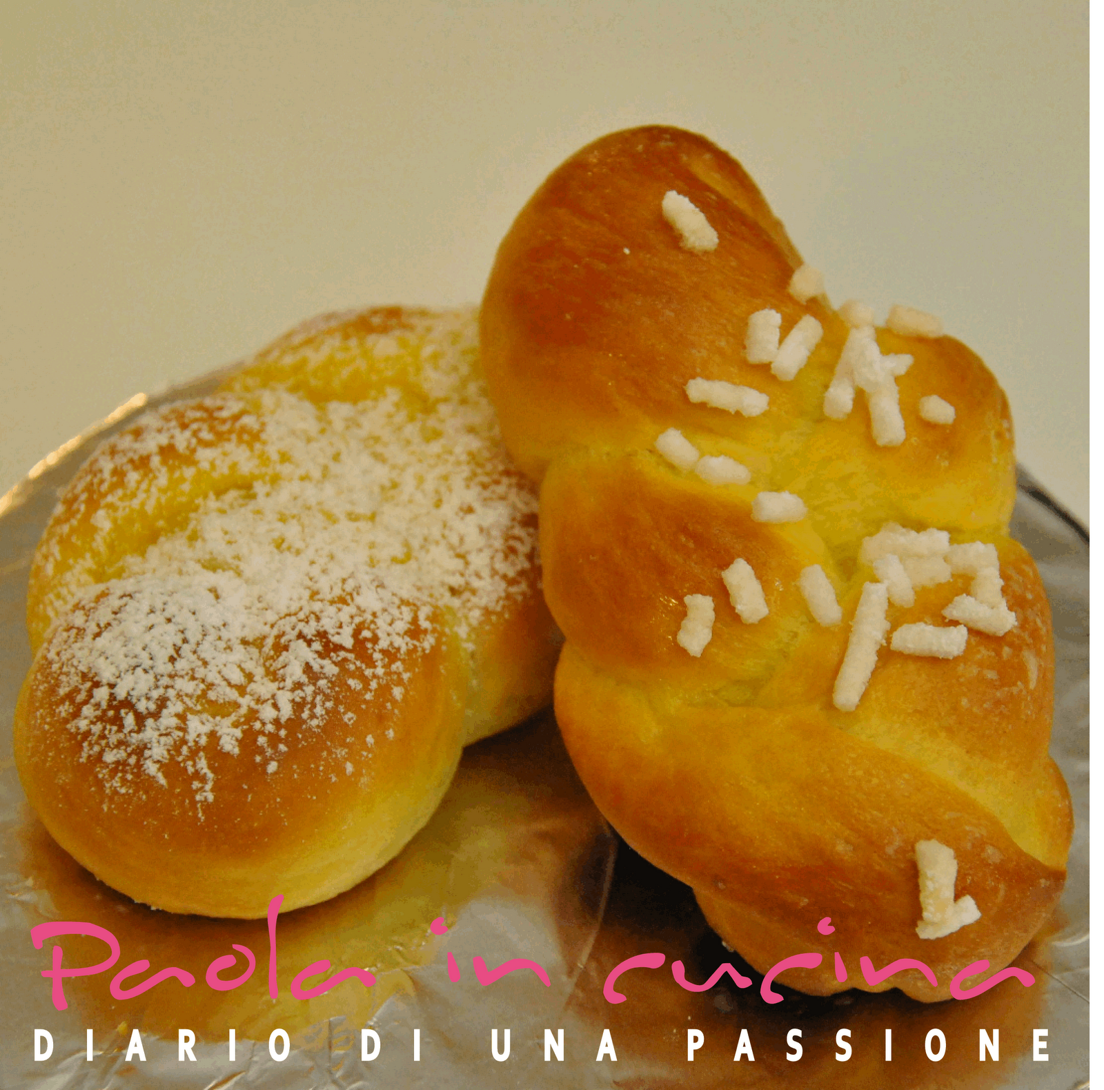 Per prima cosa fate sciogliere il burro e lasciatelo raffreddare. Sgranate il lievito nel latte intiepidito e mischiate fino a che si sarà sciolto. Unite lo zucchero e la farina, versate il latte e iniziate a impastare. Aggiungere un tuorlo alla volta (prima di aggiungere il secondo aspettate che il primo sia bene incordato nell'impasto) e per ultimo il burro. Otterrete un impasto molto morbido, ...è così che dev'essere. Lasciate puntare l'impasto coperto per un'ora. Riprendetelo e dinibete in 24 panetti. Stendetene uno per uno a "serpentina" lunga 30 cm, date un taglio agli ultimi 10 cm. Attaccate la testa del piccolo filoncino proprio sulla metà di quello lungo, formando una T. Intrecciate fino a formare le trecce. Disponetele direttamente sulle teglie con carta, distanziandole a dovere. Spennellate con l'albume leggermente sbattuto e lasciate lievitare per un paio d'ore. Decorate con la crema al limone o semplicemente con granelli di zucchero prima di infornarli. La cottura è a 180° per circa 10-12 minuti. Appena tolte spruzzate con zucchero a velo.