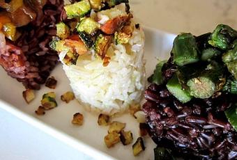 Pesate i tre differenti tipi di riso. Portate ad ebollizione tre pentolini di acqua salata e cuocete secondo i tempi richiesti. Mentre il riso basmati e il Jasmine cuociono in 20/25 minuti, il riso Venere richiede 40 minuti. Regolatevi con i tempi.Iniziate a preparare il condimento per il riso basmati. Lavate la zucchina e tagliatela a cubetti non troppo grandi. Scaldate un filo di olio evo e fateli rosolare, salandoli a piacere. Pestate in un mortaio le mandorle, in modo da avere delle briciole piuttosto grosse. Unitele alle zucchine e insaporite con lo zenzero in polvere secondo il vostro gusto. Io ne ho aggiunto circa 1/3 di cucchiaino. Spegnete il fuoco e lasciate da parte.