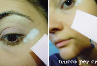 Dopo aver fatto la base viso e messo la base occhi, immergete la punta della spugnetta nella cipria, anche abbondantemente, poi tamponate in un solo gesto all’angolo esterno dell’occhio, fate attenzione a posizionare la spugnetta tra la linea immaginaria del lato del naso e la fine delle sopracciglia, proprio come si fa per fare le sopracciglia.