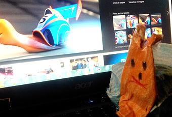 Tornati a casa, Simone si è talmente appassionato alla storia di Turbo che ha deciso di reinventarsi il personaggio appena visto con del materiale di riciclo; mi ha chiesto la possibilità di utilizzare del cotone idrofilo che gli sarebbe servito per ideare il suo personaggio per poi mettersi all’opera. Ero molto curiosa di vedere cosa saltava fuori e devo dire che il risultato finale è davvero sorprendente, cosa ne dite? Ha utilizzato solo fogli di riciclo colorati da un lato proprio con i colori di Turbo per poi riempirli di cotone idrofilo e unire i vari pezzi, corpo e guscio, con dello scotch. Che dire se non orgoglio di mamma…