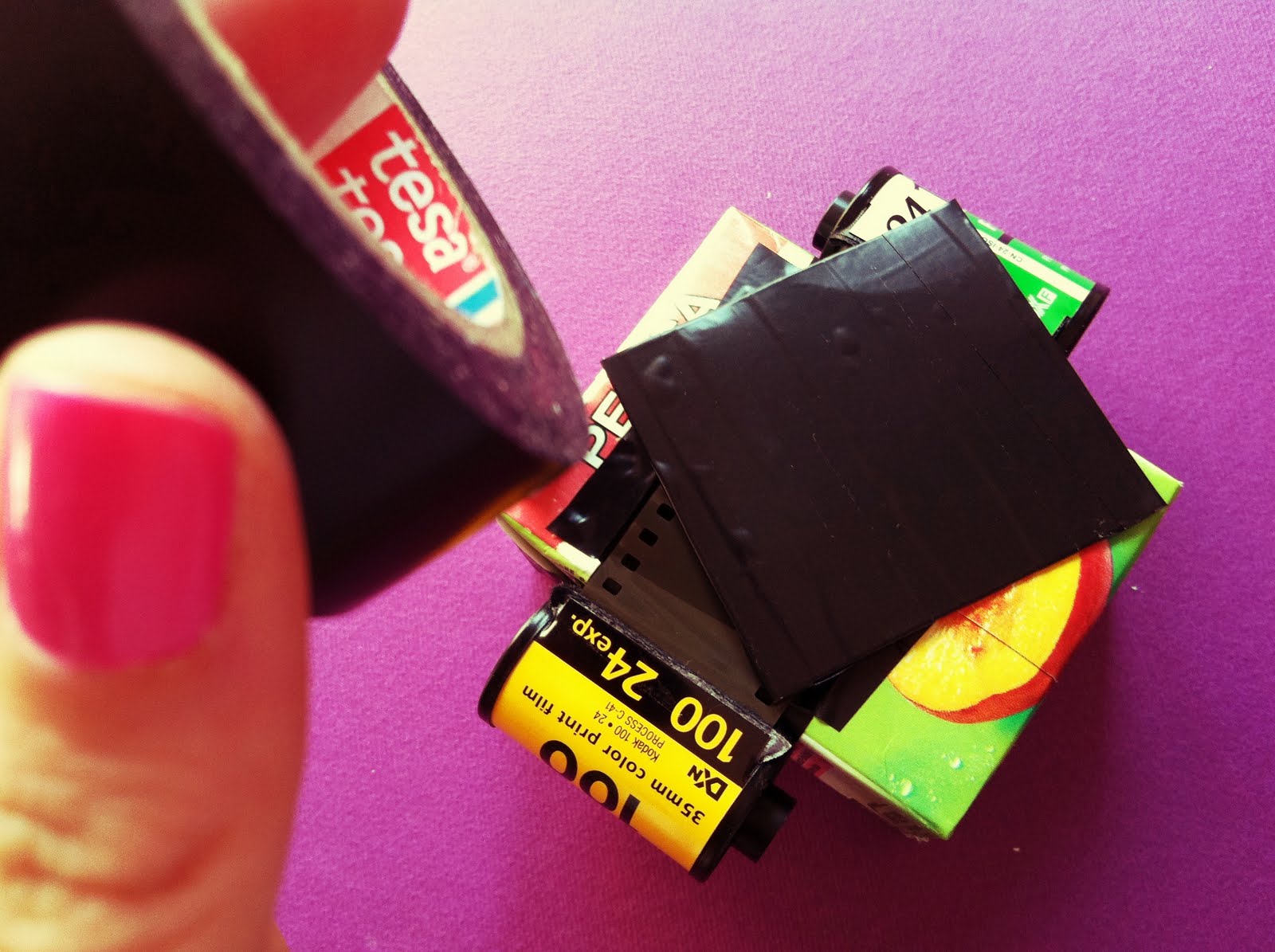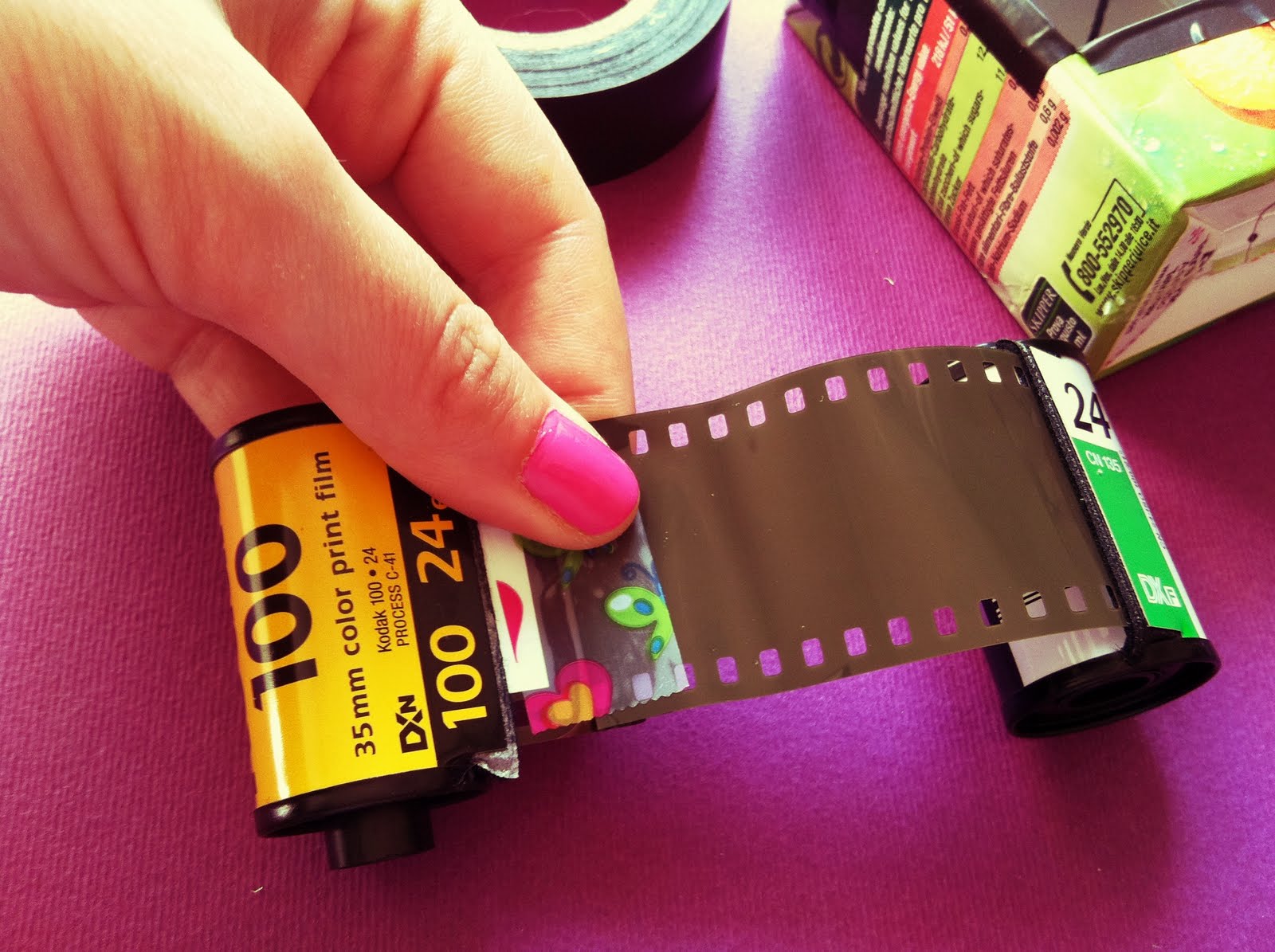 pull some of the film out of the new roll and measure it on the juice box, marking its edges with the pen. If you want photos in the common format, the resulting rectangle will have to be smaller than the actual height of the film; if on the other hand you want to have sprocket holes in your pictures, you should cut a rectangle bigger than the film, so that the latter will be impressed entirely.