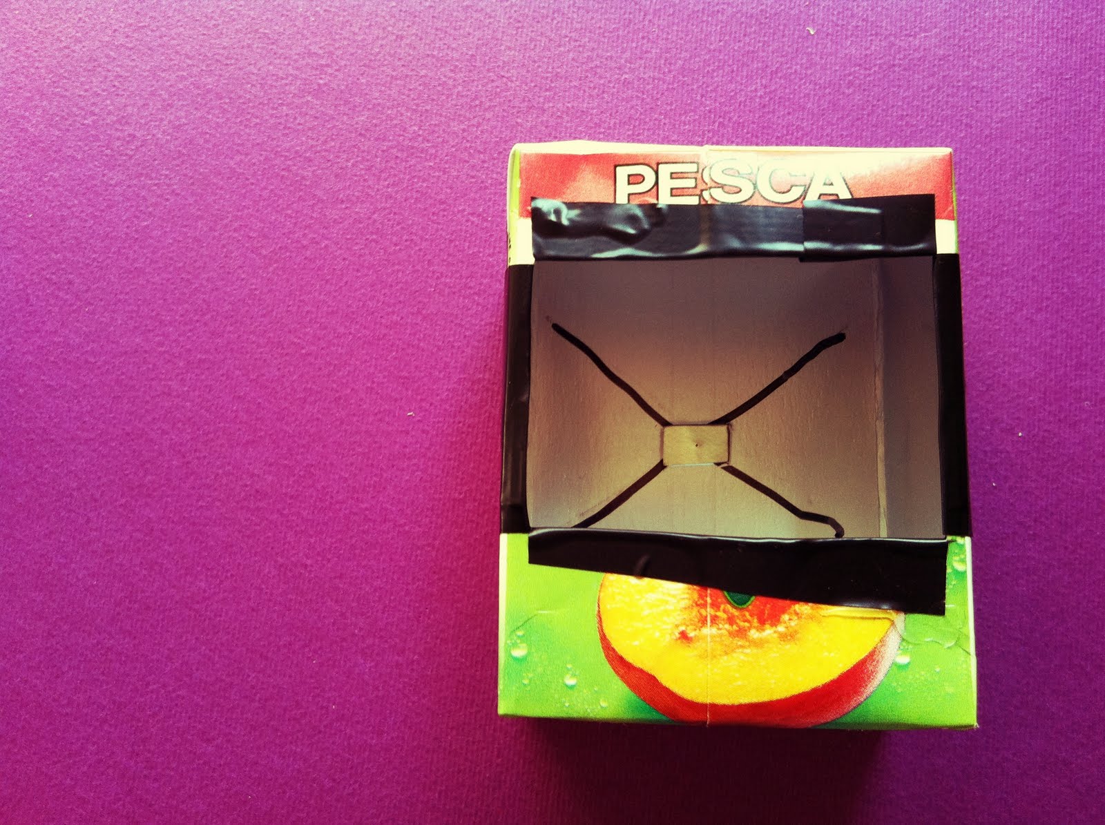 now we can attach the pierced tin-can square to the smaller window in the juice box, using some adhesive tape.