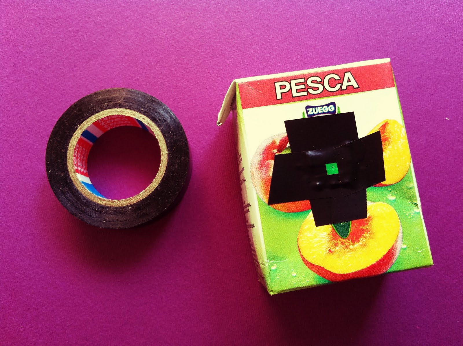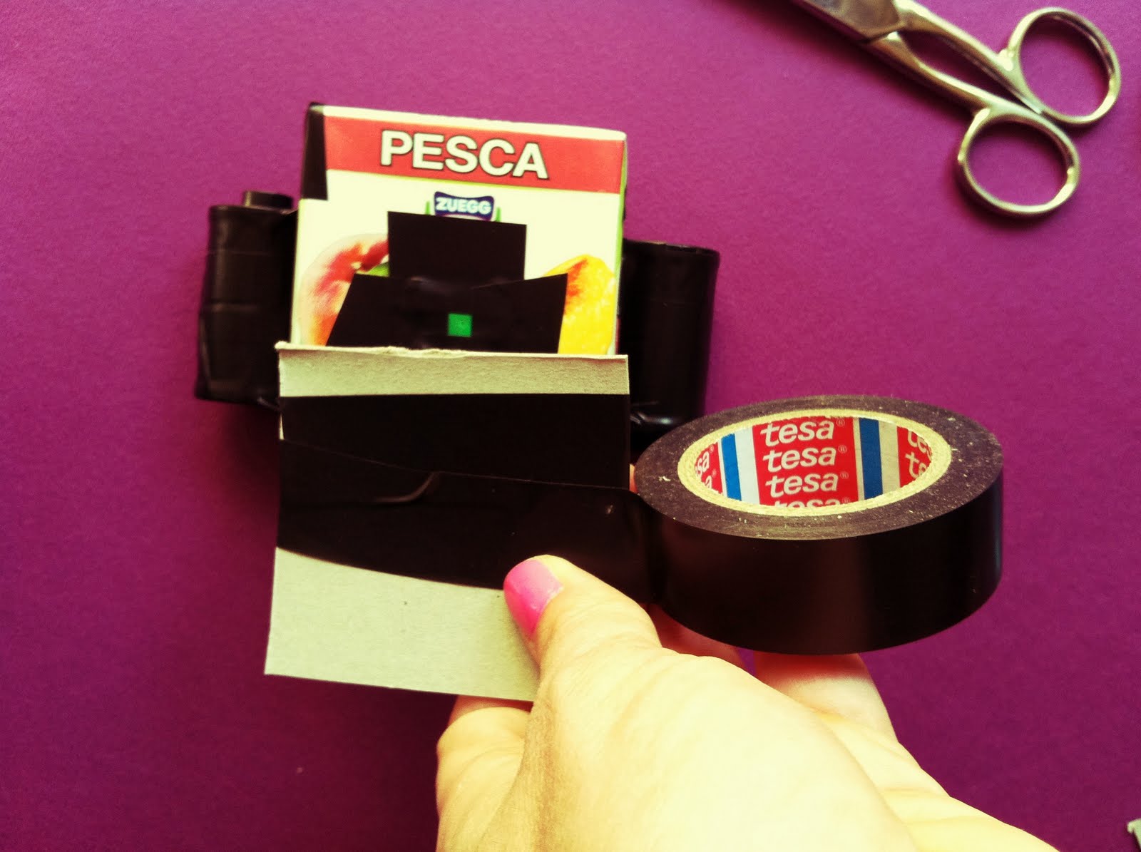 What you need: juice box, scissors, utility knife, permanent marker, hair clip (or key), adhesive tape, tin can, new film roll, old film roll (i.e. used but still having the last bit of film sticking out of the slit), cardboard, needle.