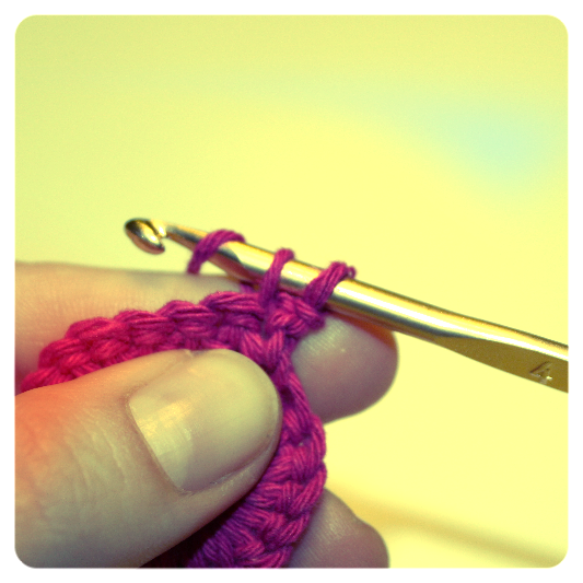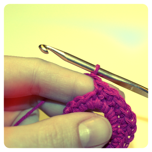 Sul cerchio iniziale proseguiamo,lavorando 1 m.b. dentro alla m.b. sottostante, fino ad arrivare al termine del lato opposto.