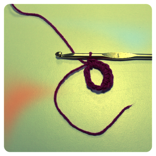1°giro.Iniziamo avviando 10 catenelle, che poi chiuderemo con 1 maglia bassissima.