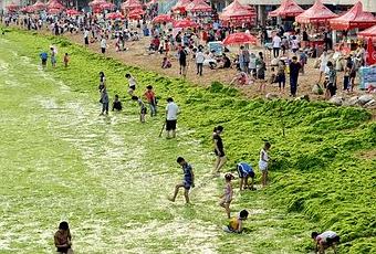La Enteromorpha prolifera fortunatamente non è tossica, come si può vedere dalla quantità di bagnanti (foto) apparentemente divertiti dal curioso fenomeno, pare che ai cinesi stia pure simpatica. (fonte e altre foto e video QUI) GPS