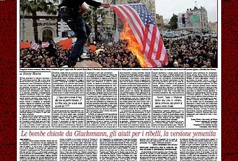 A sostegno della tesi che le rivolte popolari in Tunisia, in Egitto e in Libia nascono “laiche” e che almeno fino ad ora non mostrano di aver subito significativi condizionamenti di parte islamista, si rileva che neppure una bandiera americana è stata bruciata in piazza, né a Tunisi, né al Cairo, né a Bengasi. Il rilievo dev’essere di notevole valore se un giornale che si sta spendendo molto in questi giorni a rappresentarci come estremamente serio il rischio di una deriva islamista dei moti che agitano il Nord Africa – e parlo de Il Foglio – pubblicava ieri una foto come quella che riporto qua sopra.Foto scattata a Ramallah, in Cisgiordania, a più di 500 km dal Cairo, a più di 1500 km da Bengasi, a più di 2000 km da Tripoli, a quasi 2500 km da Tunisi. D’altronde, quando si deve dimostrare l’indimostrabile, tutto fa brodo.