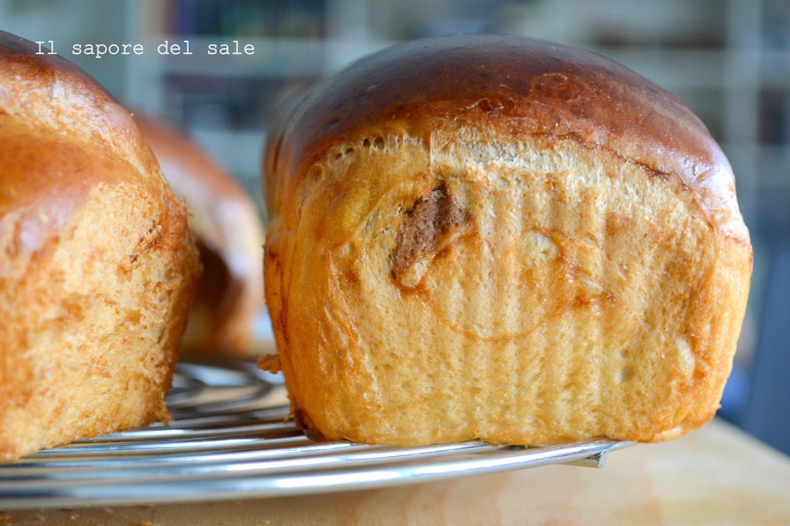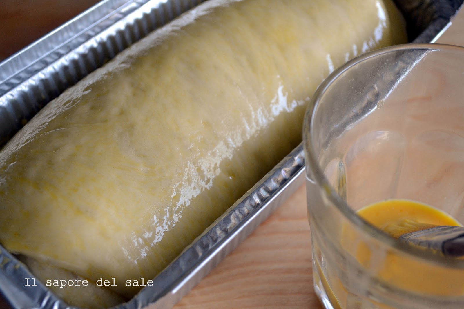 Schiacciate bene ed arrotolate stretto formando dei filoncini, avendo cura di sigillare bene alla fine della formatura e lasciando la parte sigillata sotto.Poggiate i filoncini in degli stampi da plumcake (io ho usato quelli usa e getta della cuki) imburrati e infarinati leggermente. Spennellate con la miscela di tuorlo e latte e lasciate lievitare per circa 1 ora ad una temperatura di 28°circa.