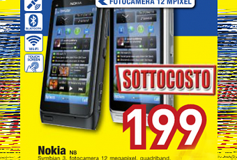 Il Nokia N8 Symbian^3, sarà aggiornabile al ben più performante e attuale Symbian Belle, è dotato di fotocamera da 12 Mpx con ottica Carl Zeiss, bluetooth, Wi-fi, GPS, uscita HDMI, USB On The Go e memoria da 16 GB espandibile con MicroSD. Sarà disponibile presso i punti vendita Nova Euronics ad un prezzo di 199 Euro.