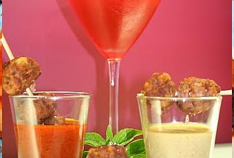Americano shakerato e polpettine alle due salseIngredienti:Per l'americano:1 1/2 oz Di Campari1 1/2 oz di Martini Rossocubetti di ghiaccio
