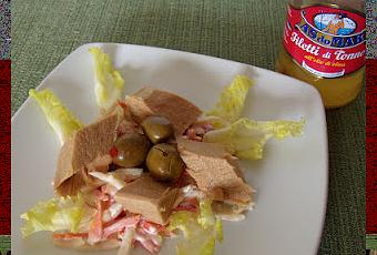 Privare l'insalatina dell'aceto e sciacquare sotto acqua corrente (lasciare scolare bene dell'acqua in eccesso) aggiungere la maionese seguendo i propri gusti e mescolare bene. Mettere in un piatto l'insalatina con la maionese adagiare i filetti di tonno as do mar e decorare con olive al peperoncino e foglie di scarola